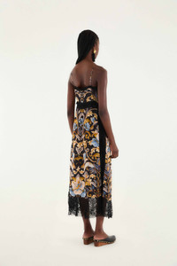 The Black Flowerful Garden Midi Dress invites you into a whimsical floral escape with its rich black backdrop adorned in golden and soft blue blooms. Featuring a gentle V neckline framed by delicate black lace, this midi silhouette gracefully hugs the waist before falling into a fluid skirt highlighted by an elegant lace hem. The slender straps and intricate lace inserts offer a tender, feminine touch, perfect for a day that flows into night with playful ease. - Closure: Invisible Zipper At Center Back - Sleeve type: Sleeveless Ref.: 340093 Composition 100% VISCOSE Care Instructions MACHINE WASH GENTLE CYCLE, DO NOT BLEACH, DO NOT TUMBLE DRY, LINE DRY, LOW IRON, DO NOT DRY CLEAN Fabric origin: India Product manufacturing: India Product printing: India