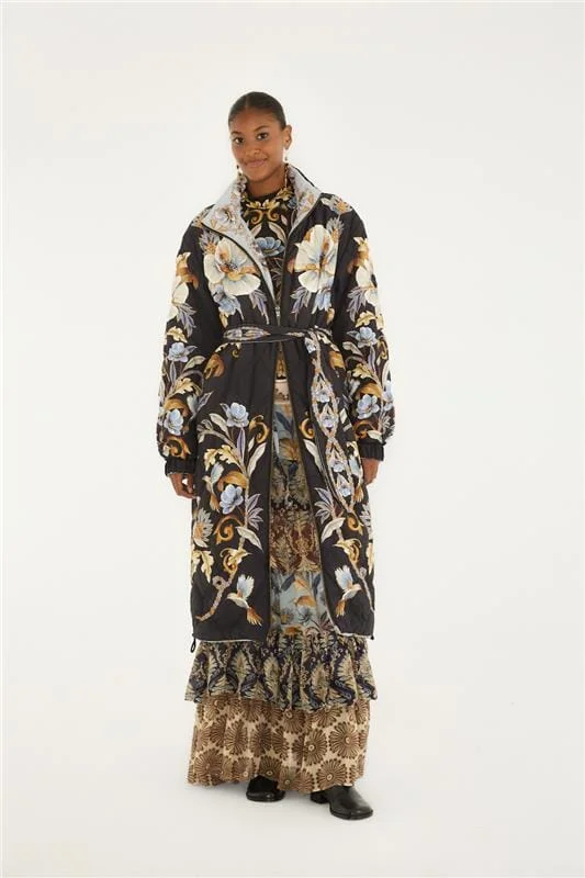 Wrap yourself in the playful spirit of FARM Rio with the Black Flowerful Snake Garden Reversible Maxi Puffer Jacket. This statement piece features a high neckline and a striking reversible design that pairs bold floral and serpent prints with deep black tones. Its maxi silhouette embraces you in warmth and movement, making every step feel like a stroll through a vibrant garden. Softly structured, it’s outerwear that transforms chilly days into colorful adventures. - Closure: Center Front Zipper - Pockets: Side Seam Pockets - Sleeve type: Long Sleeve Ref.: 340360 Composition 100% POLYAMIDE Care Instructions MACHINE WASH GENTLE CYCLE, DO NOT BLEACH, DO NOT TUMBLE DRY, DRY FLAT, IRON AT LOW HEAT, DO NOT DRY CLEAN Fabric origin: China Product manufacturing: China Product printing: China