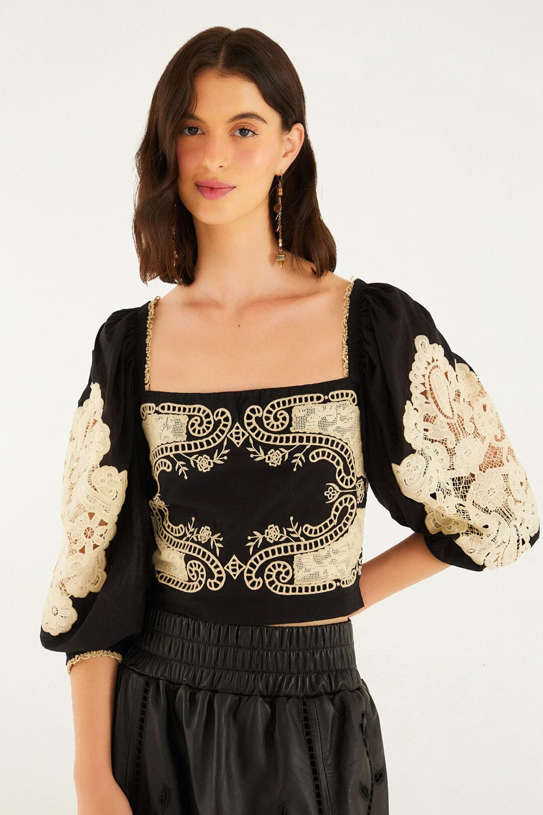 Embrace the artful charm of this Black Lace Blouse, where a graceful square neckline frames a delicate interplay of black fabric and intricate cream lace embroidery. Billowy puff sleeves adorned with floral lace inserts add a romantic volume, while the smocked back ensures a comfortable, flattering fit. This harmonious blend of bold shapes and feminine details invites warm, playful elegance into your wardrobe. - Closure: Invisible Zipper At Side Seam - Sleeve type: Long Sleeve Ref.: 340524 Composition 100% VISCOSE Care Instructions MACHINE WASH GENTLE CYCLE, DO NOT BLEACH, DO NOT TUMBLE DRY, LINE DRY, LOW IRON, DO NOT DRY CLEAN Fabric origin: India Product manufacturing: India Product printing: India