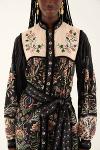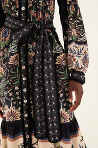 The Black Marvelous Garden Long Sleeve Maxi Dress enchants with its rich botanical prints blending soft pinks, greens, and blues against a deep black canvas. A high neckline frames delicate embroidery on the yoke, while voluminous sleeves gather into embroidered cuffs for a touch of romance. The flowing maxi silhouette is effortlessly cinched with a wide belt adorned with petite florals, weaving warmth and playful charm into every step. - Closure: Center Front Buttons - Button type: Plastic Button - Sleeve type: Long Sleeve Ref.: 340209 Composition 60% COTTON 40% VISCOSE Care Instructions MACHINE WASH GENTLE CYCLE, DO NOT BLEACH, DO NOT TUMBLE DRY, IRON AT MEDIUM HEAT, DRY CLEAN WITH ANY SOLVENT EXCEPT TRICHLOROETHYLENE Fabric origin: Turkey Product manufacturing: Turkey Product printing: Turkey