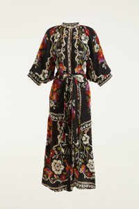 Step into effortless charm with the Black Rococo Flowers Belted Midi Dress from FARM Rio. This enchanting piece features a high neckline that gracefully frames the silhouette, while the intricate floral patterns bring a touch of whimsical elegance. A delicately cinched belt defines the waist, enhancing its flattering midi cut. Soft, flowing fabric moves with ease, inviting moments filled with warmth and playful sophistication wherever you go. - Closure: Center Front Buttons - Button type: Plastic Button - Pockets: Side Seam Pockets - Sleeve type: Elbow Lenght Sleeve Ref.: 344651 Composition 100% VISCOSE Care Instructions MACHINE WASH GENTLE CYCLE, DO NOT BLEACH, DO NOT TUMBLE DRY, LINE DRY, IRON AT LOW HEAT, DO NOT DRY CLEAN Fabric origin: India Product manufacturing: India Product printing: India
