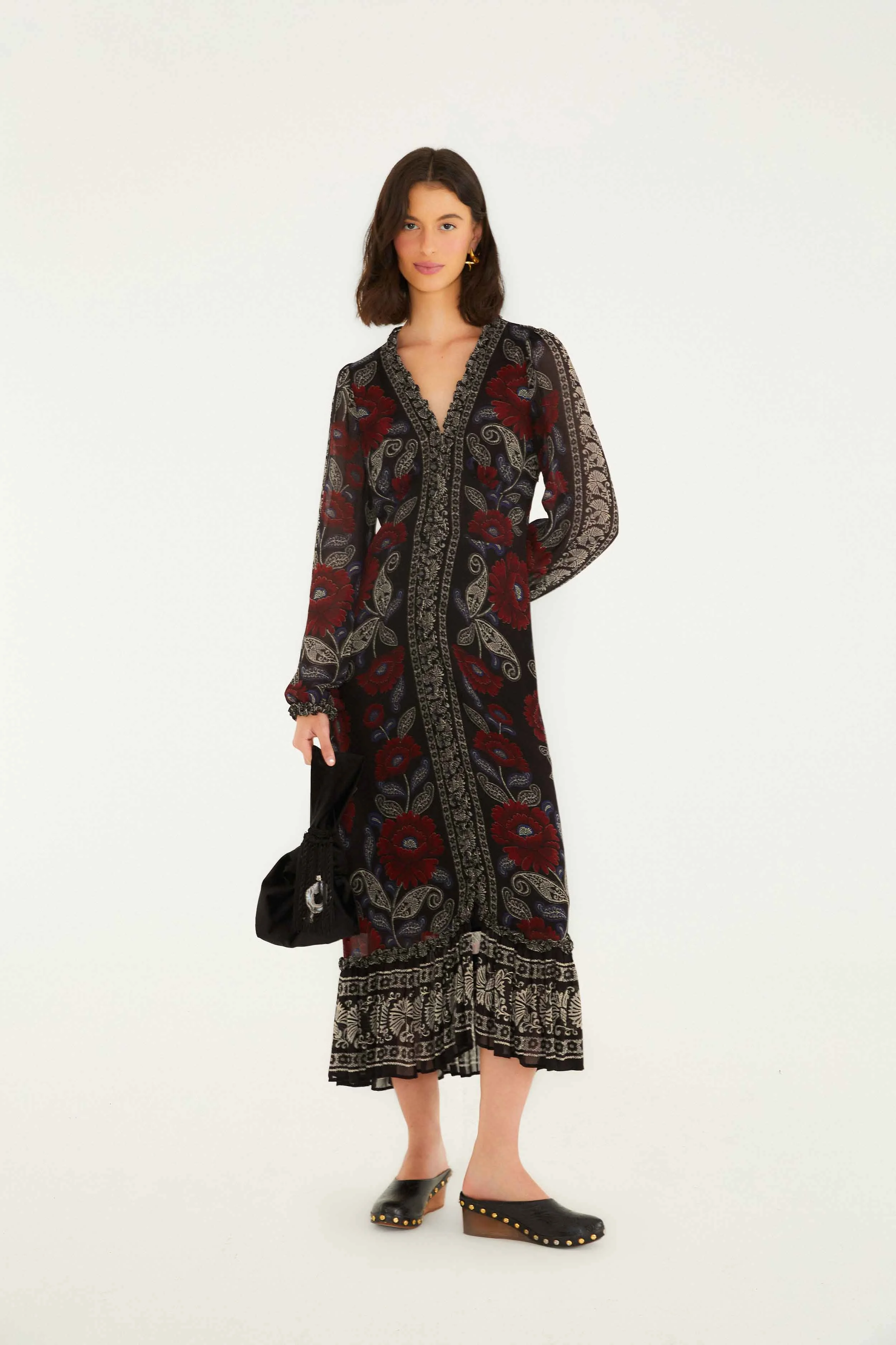 The Black Valentina Ruffled Long Sleeve Midi Dress enchants with its flowing silhouette and gentle ruffle trims that frame a flattering V neckline. Its sheer long sleeves add an airy, delicate touch, while the rich black fabric blooms with bold red and soft blue floral patterns intertwined with elegant paisley motifs. A playful frilled hem anchors the look, inviting warmth and effortless charm into every moment. - Closure: Invisible Zipper At Side Seam - Button type: Fabric Covered Button - Sleeve type: Long Sleeve Ref.: 340095 Composition 100% VISCOSE Care Instructions WASH WITH SIMILAR COLOURS, DO NOT BLEACH, TUMBLE DRY LOW, IRON ON REVERSE, DRY CLEAN ONLY Fabric origin: India Product manufacturing: India Product printing: India