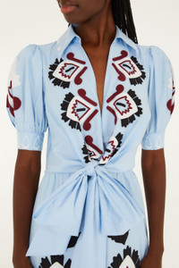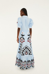 Embrace effortless elegance with the Blue Artisanal Embroidered Lace Front Bow Maxi Dress from FARM Rio. Crafted from 100% GOTS-certified organic cotton, this dress features a delicate V neckline and intricate hand-embroidered lace that dances across the bodice. The flowing silhouette is softened by a charming front bow, creating a playful yet graceful movement. Its deep blue hue echoes warm Brazilian sunsets, inviting a sense of joyful freedom and natural beauty. - Closure: Invisible Zipper At Side Seam - Button type: Fabric Covered Button - Sleeve type: Short Sleeve Ref.: 344655 Composition 100% COTTON Care Instructions HAND WASH SEPARATELY, DO NOT BLEACH, DO NOT TUMBLE DRY, LINE DRY, IRON AT LOW HEAT, DO NOT DRY CLEAN Fabric origin: China Product manufacturing: China Product printing: China