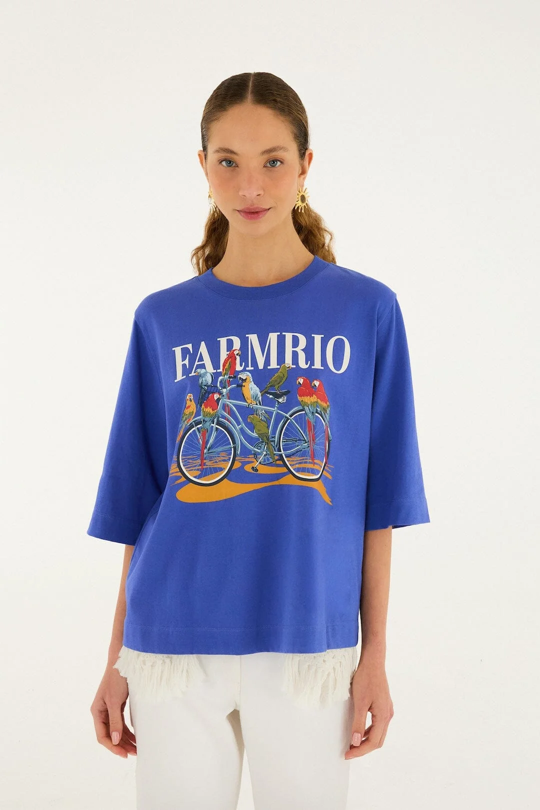 Embrace effortless charm with the Blue Bike Birds Organic Cotton T-Shirt from FARM Rio. Crafted from soft, GOTS-certified organic cotton, this top features a cheerful print of whimsical blue birds perched on bicycles, bringing playful energy to your wardrobe. Its classic round neckline and relaxed fit create a flattering silhouette, while the breathable fabric ensures all-day comfort. This tee celebrates joyful moments and sustainable style with a fresh, vibrant spirit.- Sleeve type: Short Sleeve Ref.: 348538 Composition 100% COTTON Care Instructions MACHINE WASH, GENTLE CYCLE, WASH INSIDE OUT, DO NOT BLEACH, DO NOT TUMBLE DRY, LINE DRYING, IRON AT MEDIUM HEAT, DO NOT DRY CLEAN, WASH WITH SIMILAR COLOURS Fabric origin: Turkey Product manufacturing: Turkey Product printing: Turkey