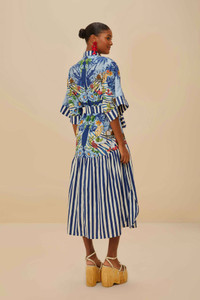 Discover the charm of the Blue Fresh Table Scarf Organic Cotton Midi Dress by FARM Rio. This delightful piece features vibrant tropical prints intertwined with classic blue and white stripes, creating an eye-catching contrast. The collar neckline adds a touch of sophistication, while the relaxed silhouette and mid-length hem offer effortless elegance. Crafted from responsible materials, this dress is perfect for those who embrace both style and nature. - Closure: Center front buttons - Button type: Plastic button - Sleeve type: Short sleeve GOTS-certified organic cotton has a lower environmental impact than conventional cotton, as it reduces water usage, greenhouse gas emissions, and the amount of chemicals used. Ref.: sku_336282 Composition 100% COTTON Care Instructions MACHINE WASH GENTLE CYCLE, DO NOT BLEACH, DO NOT TUMBLE DRY, LINE DRYING, IRON AT LOW HEAT, DO NOT DRY CLEAN Product manufacturing: CHINA Product printing: CHINA
