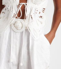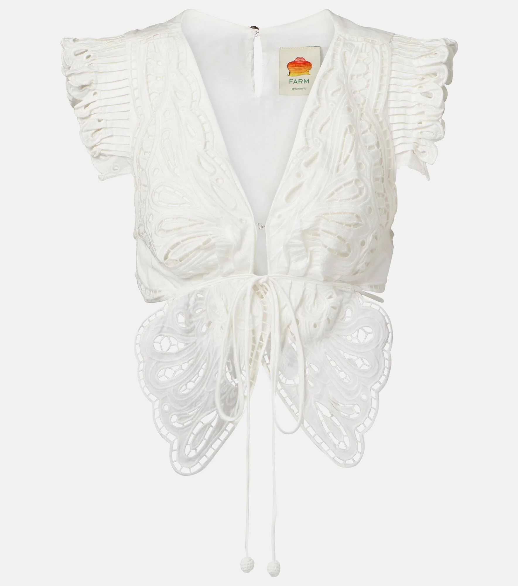 Made from pure cotton, this summery Farm Rio top is inspired by delicate butterflies. The whimsical design features a slightly cropped silhouette with the lower part cut to represent wings, and it's finished with an elaborate broderie anglaise pattern throughout. Product Details - Material: 100% cotton - Care instructions: hand wash - Made in China - Designer color name: Off-White - Item color: white - Lining: 100% cotton - Closure: self-ties, buttoned front - Item number: P01056502 Size & Fit - True to size - Cinched waist - Non-stretchy fabric - Cropped - The model seen in the picture is 178cm-5'10" and wearing a size XS