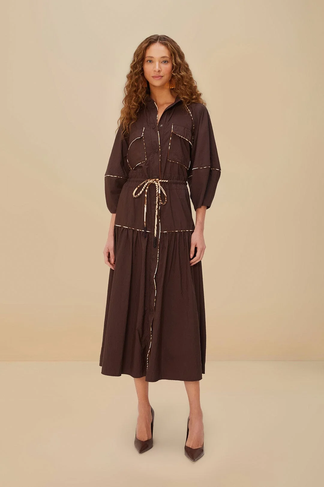 Discover the captivating allure of the brown chemise midi dress. This enchanting piece features a rich earth-toned palette adorned with intricate floral patterns that flow seamlessly down the textured fabric. Its high neckline offers a touch of elegance, while the relaxed midi cut ensures effortless movement. Soft ruffles cascade along the hem, adding playful dynamics to your steps. Embrace the joyful essence of FARM Rio with this timeless wardrobe treasure. - Closure: Center front buttons - Button type: Fabric covered button - Pockets: Patch pockets - Sleeve type: Long sleeve Ref.: sku_346562 Composition 100% POLYAMIDE Care Instructions HAND WASH SEPARATELY, DO NOT BLEACH, DO NOT TUMBLE DRY, DRY FLAT, DO NOT IRON, DO NOT DRY CLEAN Product manufacturing: CHINA Product printing: CHINA