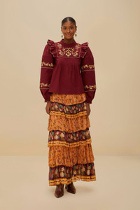 The Burgundy Golden Embroidered Organic Cotton Blouse brings a touch of elegance and charm with its high neckline and opulent golden embroidery. Crafted from responsible materials, this piece dazzles with intricate patterns, voluminous sleeves, and playful ruffled shoulders. The deep burgundy hue beautifully complements the delicate floral embroidery, creating a harmonious blend of warmth and sophistication. A perfect piece for elevating everyday style with a playful twist. - Closure: Keyhole with button - Button type: Fabric covered button - Sleeve type: Long sleeve 100% Certified Organic Cotton: it has proven a lower environmental impact than conventional cotton, as it reduces water usage, greenhouse gas emissions, and the amount of chemicals used. Ref.: sku_342003 Composition 100% COTTON Care Instructions HAND WASH GENTLE CYCLE, DO NOT BLEACH, DO NOT TUMBLE DRY, LINE DRY, COOL IRON ON REVERSE, DO NOT DRY CLEAN Product manufacturing: INDIA Product printing: INDIA
