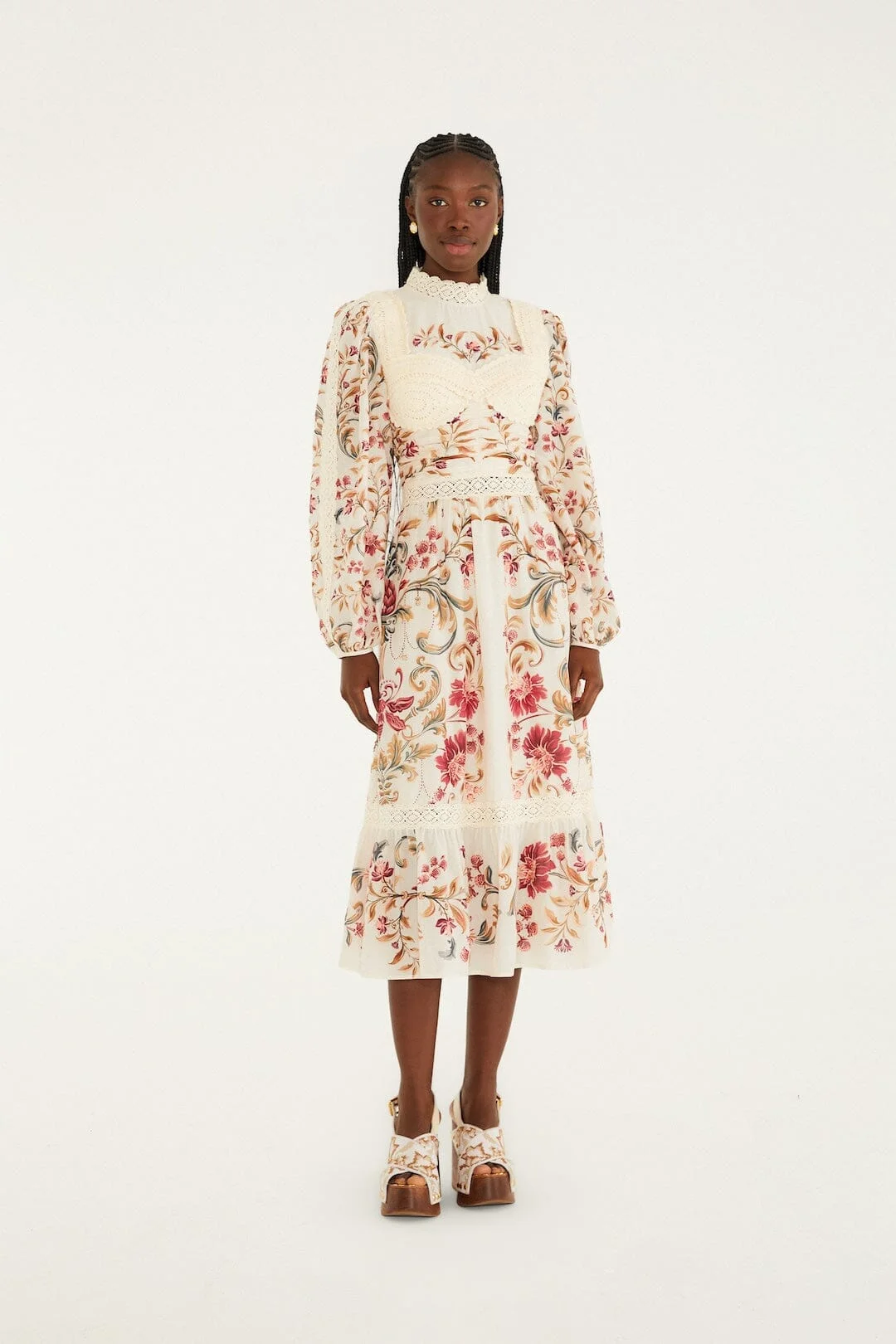 Embrace effortless charm with the Cream Royal Garden Long Sleeve Crochet Midi Dress from FARM Rio. Its intricate crochet pattern weaves a delicate garden-inspired motif, while the high neckline offers a graceful silhouette. The creamy hue invites warmth and softness, perfectly complementing the dress’s flowing midi length and gently flared sleeves. Playful yet refined, this dress captures the spirit of nature with a touch of bohemian elegance that feels both intimate and radiant. - Closure: Invisible Zipper At Center Back - Sleeve type: Long Sleeve Ref.: 344208 Composition 100% COTTON Care Instructions MACHINE WASH GENTLE CYCLE, DO NOT BLEACH, DO NOT TUMBLE DRY, LINE DRY, IRON AT LOW HEAT, DO NOT DRY CLEAN Fabric origin: India Product manufacturing: India Product printing: India