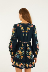 Embrace effortless charm with the Dark Blue Maira Floral Mini Dress by FARM Rio. Crafted from eco-friendly Euroflax and Lenzing fibers, this dress features a playful floral pattern that dances across a deep blue canvas. The round neckline and relaxed silhouette flow gently, while subtle details bring softness and joy to every move. Perfect for those who cherish vibrant nature-inspired style with a conscious heart. - Closure: Invisible Zipper At Side Seam - Sleeve type: Long Sleeve Ref.: 349060 Composition 55% LINEN 45% VISCOSE Care Instructions HAND WASH SEPARATELY, DO NOT BLEACH, DO NOT TUMBLE DRY, LINE DRYING, IRON AT LOW HEAT, DO NOT DRY CLEAN Fabric origin: China Product manufacturing: China Product printing: China