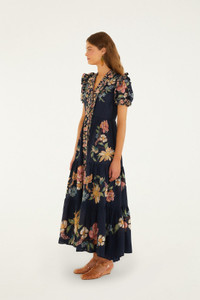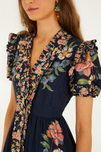 Embrace the vibrant spirit of FARM Rio with the Dark Blue Maira Floral Maxi Dress. Painted in deep navy hues, its playful floral pattern bursts with warmth and joy. The flowing silhouette cascades effortlessly, while the soft V neckline adds a touch of elegance. Short sleeves balance comfort with charm, making this dress a perfect expression of carefree sophistication and tropical delight, designed to brighten every moment you wear it. - Closure: Center Front Buttons - Button type: Fabric Covered Buttons - Sleeve type: Short Sleeve Ref.: 348374 Composition 54% COTTON 46% VISCOSE Care Instructions MACHINE WASH, GENTLE CYCLE, WASH INSIDE OUT, DO NOT BLEACH, DO NOT TUMBLE DRY, LINE DRYING, IRON AT MEDIUM HEAT, DRY CLEAN WITH ANY SOLVENT EXCEPT TRICHLOROETHYLENE, WASH WITH SIMILAR COLOURS Fabric origin: Turkey Product manufacturing: Turkey Product printing: Turkey