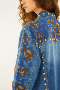 The Denim Metal Details Embroidered Jacket from FARM Rio brings warmth and spirit to your outerwear collection. Crafted in soft blue denim, it features a classic collar neckline and playful embroidered floral motifs in rich tones of blue, brown, and gold across the sleeves and shoulders. Round metal studs elegantly frame the front pockets, collar, cuffs, and hem, adding a touch of bold texture that balances the jacket’s relaxed silhouette with delightful artistry. - Closure: Center Front Buttons - Button type: Metal Button - Pockets: Patch Pockets - Sleeve type: Long Sleeve Ref.: 340608 Composition 100% COTTON Care Instructions MACHINE WASH GENTLE CYCLE, DO NOT BLEACH, DO NOT TUMBLE DRY, LINE DRYING, IRON AT MEDIUM HEAT, DRY CLEAN WITH ANY SOLVENT EXCEPT TRICHLOROETHYLENE Fabric origin: Turkey Product manufacturing: Turkey Product printing: Turkey