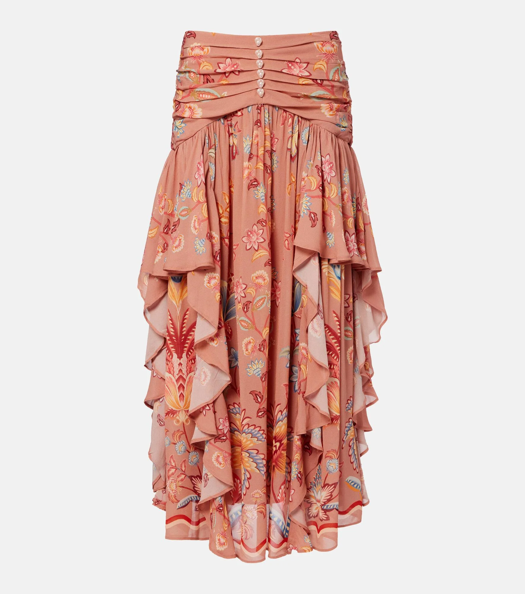Farm Rio's ethos revolves around celebrating Brazilian cultural heritage and finding inspiration in diverse landscapes. This maxi skirt is made to a ruffled silhouette with a floral design and refined faux pearls at the front. Product Details - Material: 100% viscose - Care instructions: machine wash at 30 degrees - Made in India - Color: multicoloured - Designer color name: Boho Enchance Mocha - Lining: 100% viscose - Closure: concealed zipped back - Item number: P01150814 Size & Fit - True to size - Non-stretchy fabric - The model seen in the picture is 178cm-5'10" and wearing a size XS