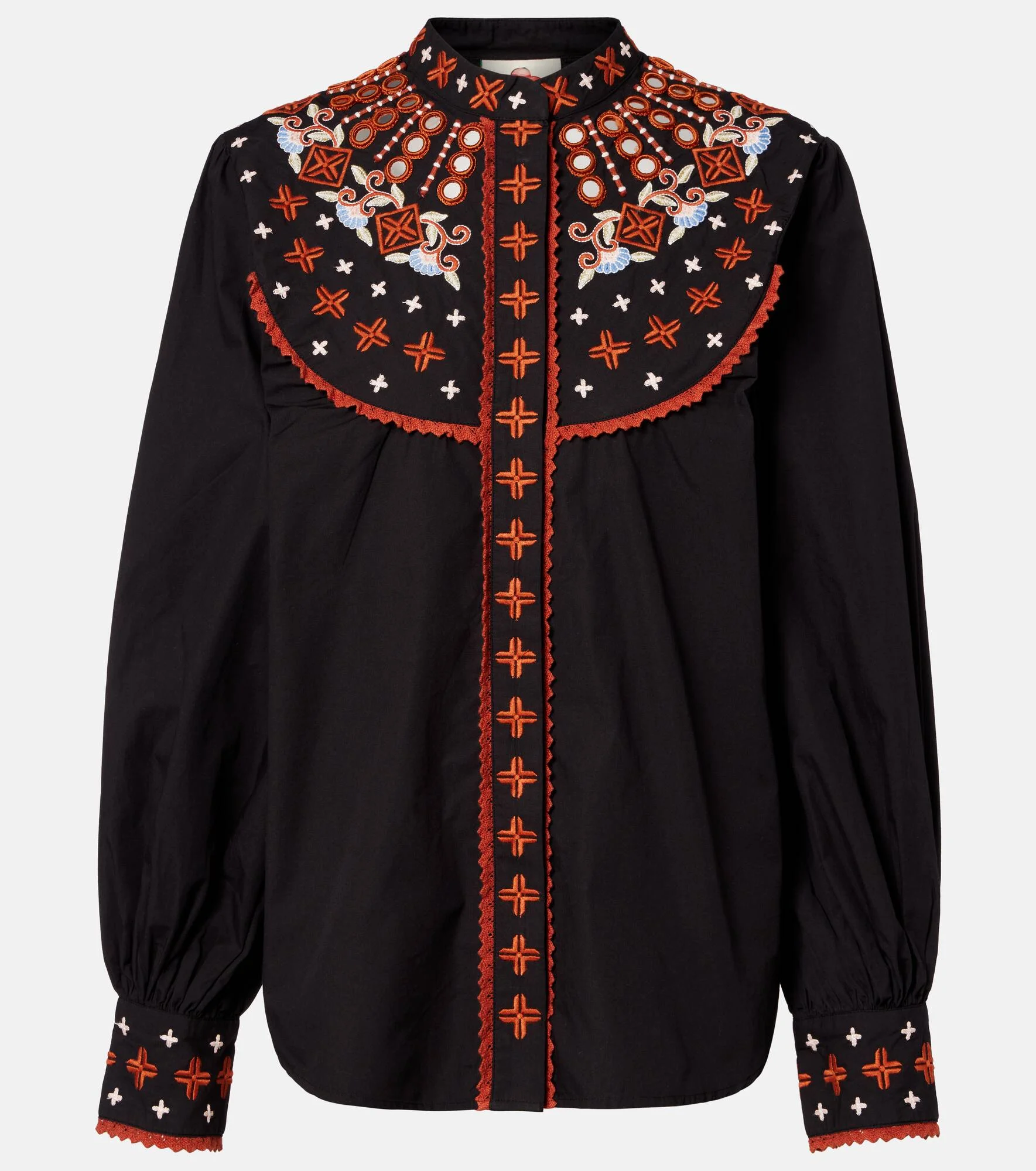 Farm Rio's ethos revolves around celebrating Brazilian cultural heritage, finding inspiration in diverse landscapes. This shirt has a concealed button placket and features an intricate embroidery. Product Details - Material: 100% cotton - Care instructions: machine wash at 30 degrees - Made in India - Designer color name: Black - Item color: black, orange - Closure: concealed buttoned front - Cuff: two buttons - Item number: P01120778 Size & Fit - True to size - Designed for a loose fit - Non-stretchy fabric - Falls below the hip - The model seen in the picture is 178cm-5'10" and wearing a size XS