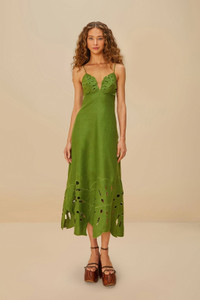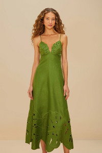 Embrace the essence of tropical elegance with the Green Monstera Embroidered Euroflax™ Premium Linen Midi Dress. Crafted from responsible materials, this dress features exquisite monstera leaf embroidery, creating a captivating silhouette. The V neckline beautifully enhances its feminine charm, while the lush green hue evokes nature’s serenity. Perfect for adding a playful yet sophisticated touch to your wardrobe, this piece embodies the joyful spirit of FARM Rio. - Closure: Invisible zipper at center back - Sleeve type: Sleeveless Euroflax™ Premium Linen: certified GMO-free plant fiber produced without artificial irrigation that has guaranteed traceability and proven comfort, thermoregulation, moisture management, and breathability. Ref.: sku_335747 Composition 100% LINEN Care Instructions HAND WASH SEPARATELY, DO NOT BLEACH, DO NOT TUMBLE DRY, DRY FLAT, IRON AT LOW HEAT, DRY CLEAN WITH ANY SOLVENT EXCEPT TRICHLOROETHYLENE Product manufacturing: CHINA Product printing: CHINA