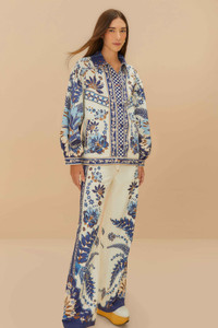 Step into a tropical dream with the Off-White Encanto Tropical Pants by FARM Rio. Crafted from responsible materials, these pants feature exquisite floral embroidery in deep blue shades, gracefully adorning the wide-leg silhouette. The artistic botanical patterns capture the essence of nature's charm, bringing a playful and breezy vibe to your wardrobe. Embrace the enchanting allure of these uniquely detailed trousers, perfect for adding a soft touch of whimsy to your day. Ref.: sku_337173