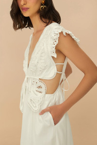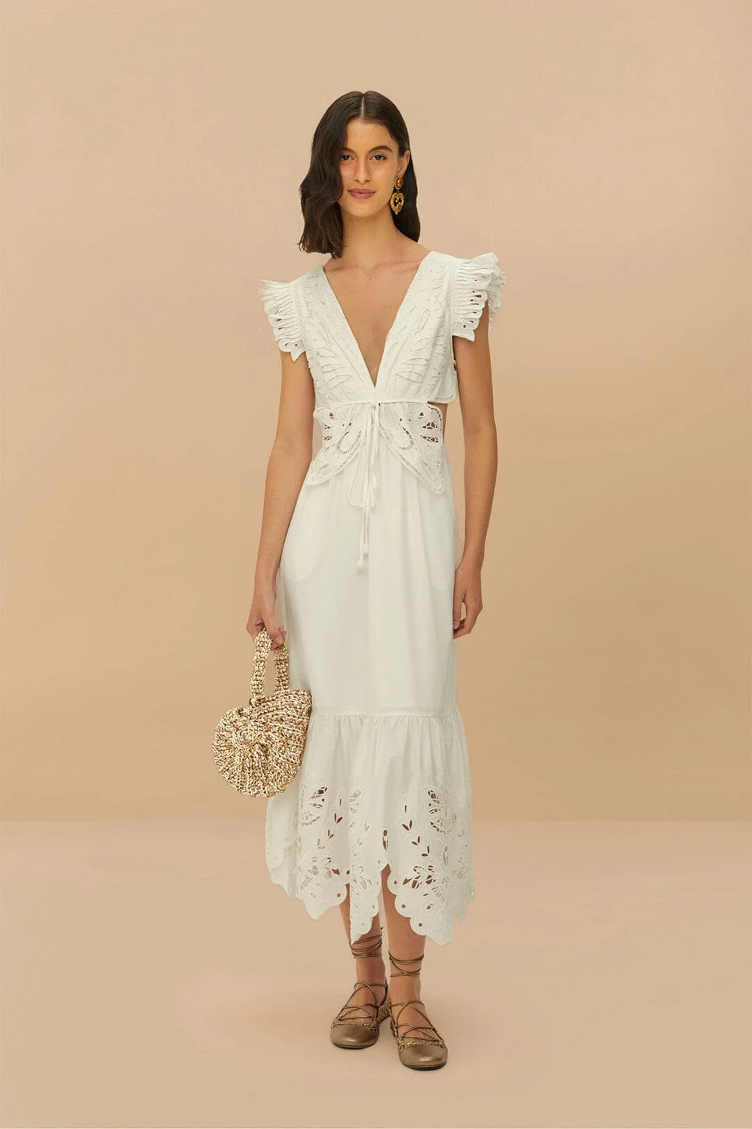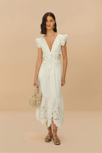 Embrace elegance with the off-white butterfly richelieu midi dress from Farm Rio. This delightful piece features a charming V neckline and playful cutout details, accentuated by intricate richelieu embroidery resembling fluttering butterflies. The flutter sleeves add a touch of whimsy, while the gently flowing silhouette ensures a graceful movement. Perfect for basking in the warmth of summer days, this dress promises a timeless, dreamy allure. FARM Rio Ref.: sku_332740 Composition 100% COTTON Care Instructions HAND WASH SEPARATELY, DO NOT BLEACH, DO NOT TUMBLE DRY, DRY FLAT, IRON AT LOW HEAT, DRY CLEAN WITH ANY SOLVENT EXCEPT TRICHLOROETHYLENE Product manufacturing: CHINA Product printing: CHINA