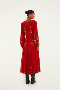 This Red Berry Garden Long Sleeve Pleated Maxi Dress enchants with its radiant red hue adorned by intricate garden-inspired floral prints in warm autumn shades. The V neckline and the subtle keyhole with a delicate knot enhance its graceful silhouette, while the softly pleated sleeves and skirt bring a fluid, effortless movement. A matching waist tie elegantly defines the figure, infusing a playful, feminine spirit into this flowing maxi dress. - Closure: Invisible Zipper At Center Back - Button type: Beaded Button - Sleeve type: Long Sleeve Ref.: 345755 Composition 100% VISCOSE Care Instructions MACHINE WASH GENTLE CYCLE, DO NOT BLEACH, DO NOT TUMBLE DRY, LINE DRYING, IRON AT LOW HEAT, DO NOT DRY CLEAN Fabric origin: India Product manufacturing: India Product printing: India