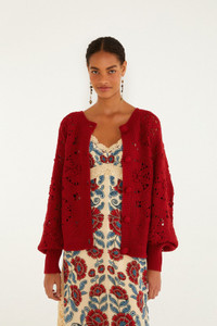 Delight in the cozy allure of this Red Crochet Flower Knit Cardigan, woven with intricate crochet flowers that bring the warmth of handcrafted artistry to life. Its relaxed silhouette and billowy sleeves evoke a gentle ease, while the round neckline frames softly. This vibrant red knitwear piece invites playful layering, offering a perfect balance between bold color and delicate floral detailing, making every moment feel like a comforting embrace. - Closure: Center Front Buttons - Button type: Crochet Button - Sleeve type: Long Sleeve Ref.: 345805 Composition 65% ACRYLIC 20% POLYAMIDE 15% WOOL Care Instructions HAND WASH COLD, DO NOT BLEACH, DO NOT TUMBLE DRY, DRY FLAT, IRON COOL, DO NOT DRY CLEAN Fabric origin: China Product manufacturing: China Product printing: China