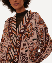 DETAILS Knit cardigan Contrast pattern design V-neckline Buttoned front closure Dropped shoulders Long sleeves COMPOSITION & CARE 50% Acrylic; 40% Polyamide; 10% Wool Hand wash only