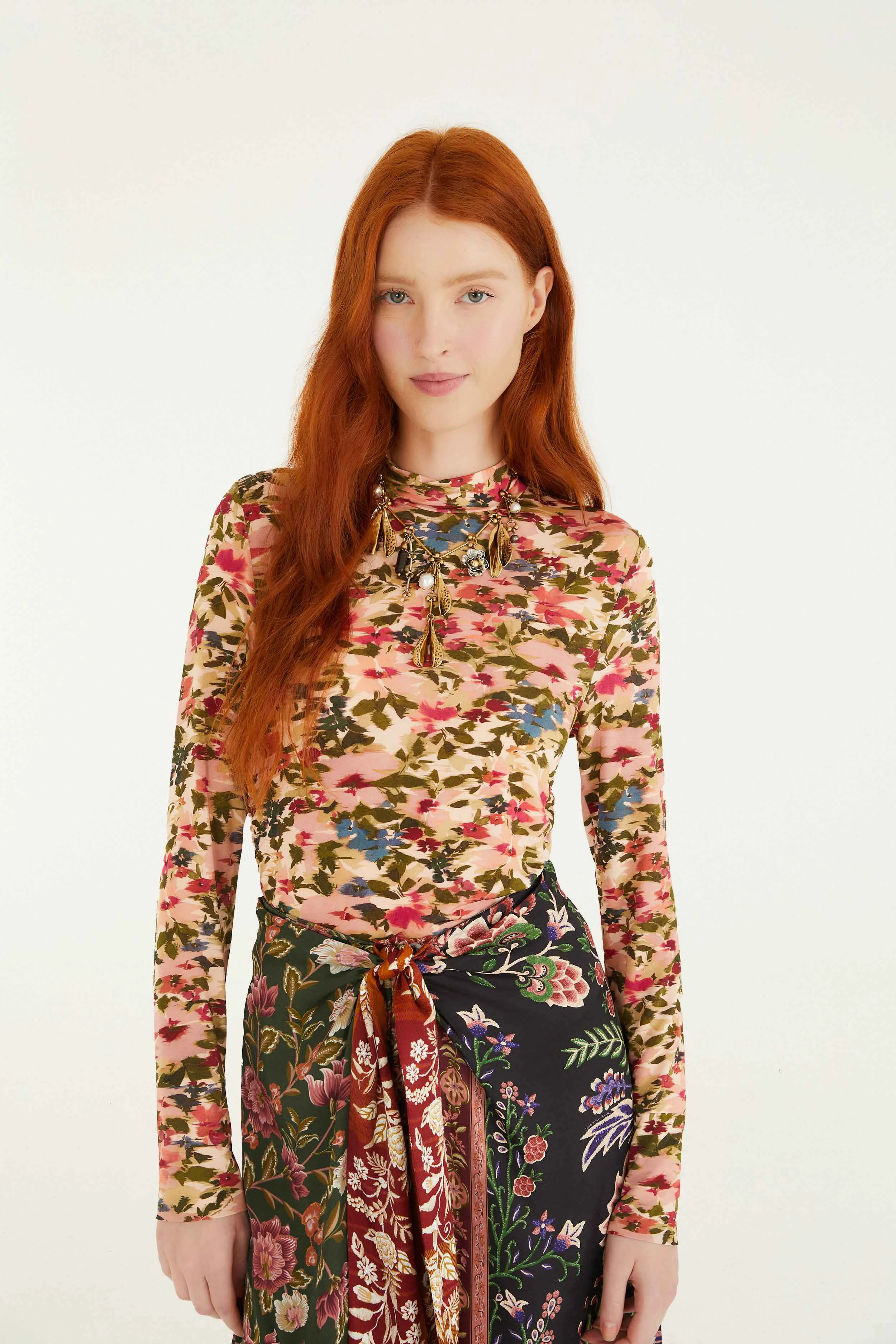 Embrace the gentle charm of the Pink Ikat Tiny Flowers Jersey Blouse, featuring a delicate floral print in warm pinks, blues, and greens that dance across a soft, flowing fabric. The high neckline offers a refined silhouette, while the subtle ruching along the sides adds a playful texture that flatters the figure. This long-sleeve top is a tender blend of comfort and artistry, perfect for days that call for effortless elegance and joyful color.- Sleeve type: Long Sleeve Ref.: 339748 Composition 85% RAYON 15% ELASTANE Care Instructions MACHINE WASH GENTLE CYCLE, DO NOT BLEACH, DO NOT TUMBLE DRY, LINE DRYING, IRON AT LOW HEAT, DRY CLEAN WITH ANY SOLVENT EXCEPT TRICHLOROETHYLENE Fabric origin: Turkey Product manufacturing: Turkey Product printing: Turkey
