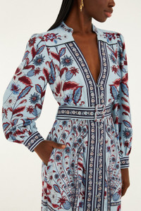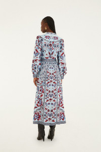 The Soft Blue Marcelle Maxi Dress brings a fresh, elevated take on a classic silhouette. Featuring the Marcelle Soft Blue print, its intricate florals and border artwork create a striking visual flow from top to bottom. The collar neckline adds a polished touch, balanced by long, relaxed sleeves for an effortless feel. Delicate fabric-covered buttons enhance the design with subtle sophistication, while the breezy skirt moves gracefully with every step. A timeless piece that blends comfort, charm, and the joyful essence of FARM Rio. Ref.: 344002 Composition 100% RAYON Care Instructions MACHINE WASH GENTLE CYCLE, DO NOT BLEACH, DO NOT TUMBLE DRY, LINE DRY, IRON AT LOW HEAT, DO NOT DRY CLEAN, REMOVE BELT BEFORE WASHING Fabric origin: CHINA Product manufacturing: CHINA Product printing: CHINA