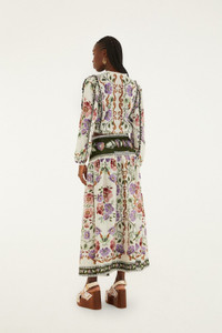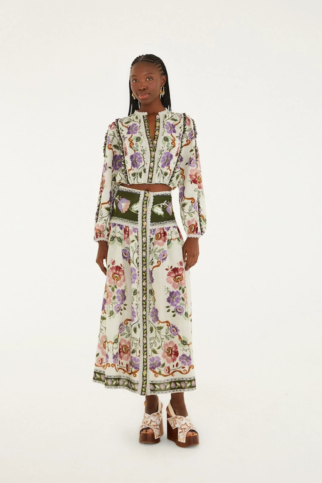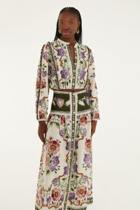 Embrace effortless charm with the Cream Rococo Flowers Lace Buttoned Midi Skirt from FARM Rio. Delicately crafted in soft cream lace, this skirt features an enchanting Rococo floral pattern that dances across the fabric. Its flattering midi silhouette gently skims the hips before flowing into a playful, buttoned front, adding a touch of vintage romance. Light, breezy, and full of texture, it’s a beautifully unique piece that invites warmth and joy into every step. - Closure: Center Front Buttons - Button type: Plastic Button Ref.: 344235 Composition 60% COTTON 40% VISCOSE Care Instructions MACHINE WASH GENTLE CYCLE, DO NOT BLEACH, DO NOT TUMBLE DRY, DRY FLAT, IRON AT MEDIUM, DO NOT DRY CLEAN Fabric origin: China Product manufacturing: China Product printing: China