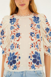 Embrace effortless charm with the Sand Renata Floral 3D Puff Sleeve Blouse from FARM Rio. This blouse features a soft round neckline and vibrant floral patterns that burst with playful energy. The standout 3D puff sleeves add a whimsical, sculptural touch, creating a lively silhouette full of movement. Light and airy, it captures the essence of joyful days under the sun, perfect for those who celebrate color and life in every detail. - Closure: Center Back Buttons - Button type: Plastic Button - Sleeve type: Short Sleeve Ref.: 344127 Composition 100% COTTON Care Instructions MACHINE WASH GENTLE CYCLE, DO NOT BLEACH, TUMBLE DRY LOW, IRON AT LOW HEAT, DO NOT DRY CLEAN Fabric origin: India Product manufacturing: India Product printing: India
