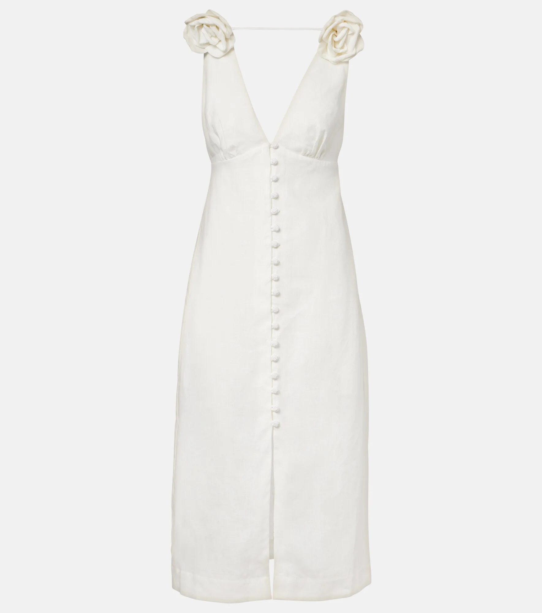 Crafted from pure, lightweight linen, this midi dress from Farm Rio offers a delicate silhouette adorned with rose-appliques on the shoulder straps. The piece is designed with a plunging V-neckline and subtle buttons at the front closure. Product Details - Material: 100% linen - Care instructions: hand wash - Made in China - Color: white - Designer color name: Off-White - Lining: 100% cotton - Closure: buttoned front, concealed zipped side - Item number: P01175798 Size & Fit - True to size - Low back - Cinched waist - Non-stretchy fabric - The model seen in the picture is 178cm-5'10" and wearing a size XS