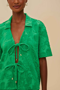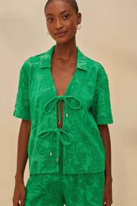 Dive into the lush vibrancy of the Green River Nature Towel Shirt by FARM Rio. This piece enchants with its enchanting tropical patterns, weaving emerald foliage over a rich green fabric. The relaxed collar neckline is complemented by playful tie details, adding a touch of whimsy. Its breezy silhouette invites warmth and adventure, making it a joyful choice for any sunlit escapade. - Closure: Tie - Sleeve type: Short sleeve Ref.: sku_341963 Composition 90% COTTON 10% POLYESTER Care Instructions MACHINE WASH GENTLE CYCLE, DO NOT BLEACH, DO NOT TUMBLE DRY, LINE DRY IN THE SHADE, IRON AT LOW HEAT, DRY CLEAN WITH ANY SOLVENT EXCEPT TRICHLOROETHYLENE Product manufacturing: CHINA Product printing: CHINA