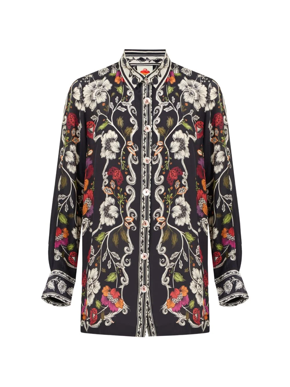 floral-print button-up shirt Highlights - Black - Floral print - Button fastening - Polo collar - Long sleeves - Buttoned cuffs Imported Composition Viscose 100% Washing instructions Read Manufacturer Guidelines