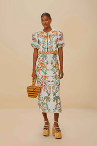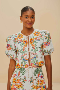 Discover the Off-White Delicate Forest Scarves Euroflax™ Premium Linen Blouse by FARM Rio. Crafted from responsible materials, this enchanting piece boasts vibrant floral patterns and a charming round neckline. Delight in the voluminous puff sleeves and the playful front ties that exude effortless elegance. Immerse yourself in the rich tapestry of colors and let the delightful design carry you through any occasion with grace and style. - Closure: Tie - Sleeve type: Short sleeve LENZING™ ECOVERO™: the eco-responsible fibers generate up to 50% lower emissions and water impact compared to generic viscose. Ref.: sku_336217 Composition 100% LINEN Care Instructions HAND WASH SEPARATELY, DO NOT BLEACH, DO NOT TUMBLE DRY, DRY FLAT, IRON AT LOW HEAT, DRY CLEAN WITH ANY SOLVENT EXCEPT TRICHLOROETHYLENE Product manufacturing: CHINA Product printing: CHINA