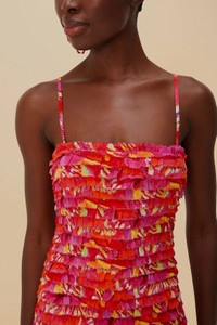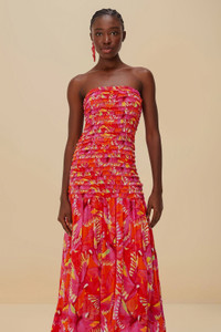 Embrace the vibrant allure of the Orange Flying Birds Strapless Midi Dress by FARM Rio. This dress enchants with its tropical bird print in a lively palette of reds and oranges, an ode to sunlit escapes. The playful ruching and square neckline combine effortlessly to create an elegant silhouette. Flowing effortlessly, this dress captures the essence of carefree days and lively nights, promising warmth and whimsy in every wear. - Closure: Invisible zipper at side seam - Button type: Plastic button - Sleeve type: Sleeveless Ref.: sku_336592 Composition 52% COTTON 48% LYOCELL Care Instructions MACHINE WASH GENTLE CYCLE, DO NOT BLEACH, DO NOT TUMBLE DRY, LINE DRY IN THE SHADE, IRON AT MEDIUM HEAT, DO NOT DRY CLEAN Product manufacturing: INDIA Product printing: INDIA