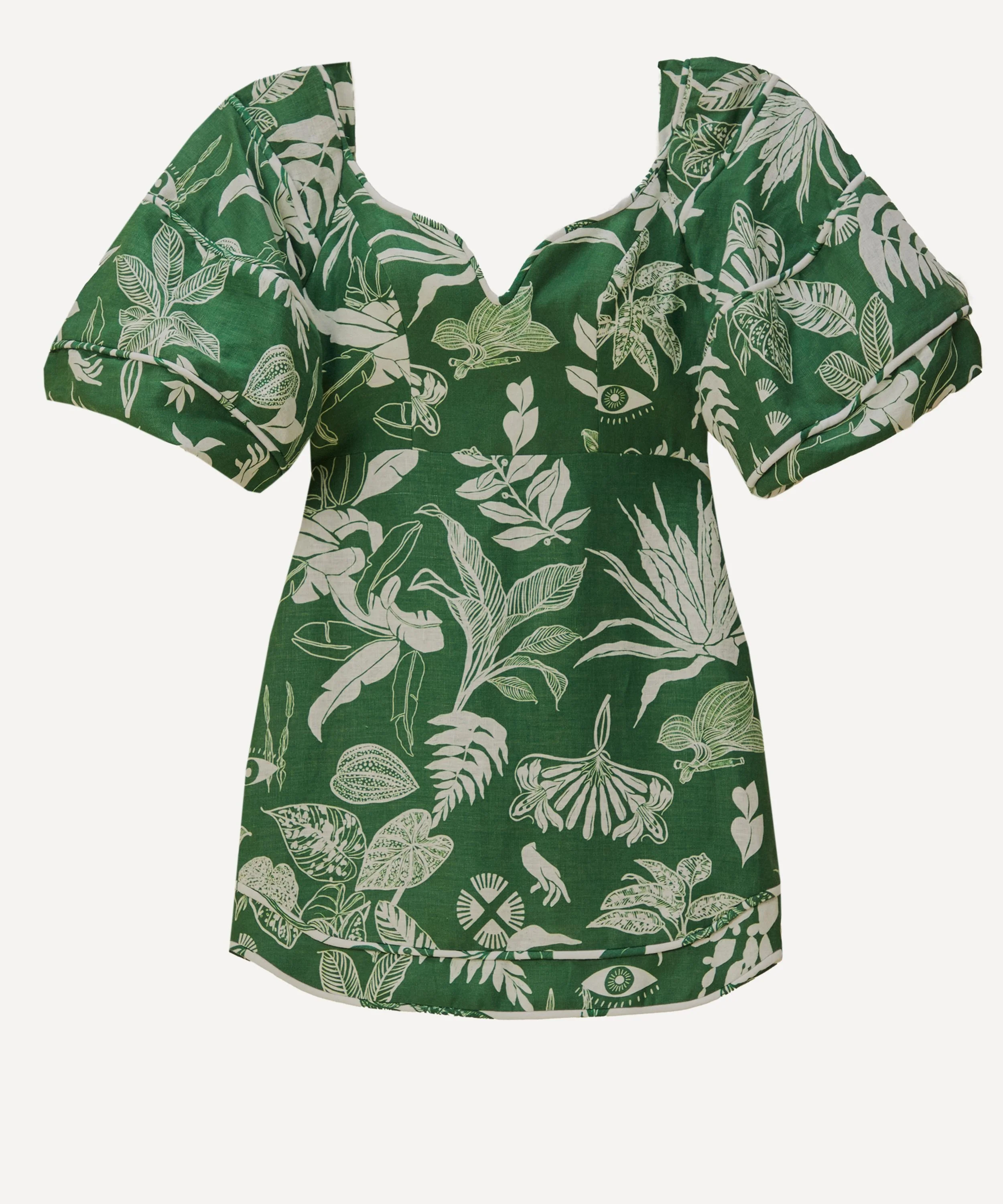 DETAILS Linen mini-dress Regular fit V-neckline Short puffed-sleeves Invisible back zipper Forest Soul print COMPOSITION & CARE 100% Linen Gentle machine wash