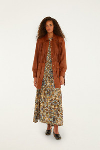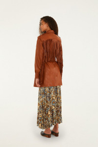 Embrace a playful spirit with FARM Rio's Brown Fringes Leather Coat. This rich caramel hue flows into a relaxed silhouette, softened by the gentle movement of long, artfully layered leather fringes across the front, back, and sleeves. The classic collar neckline adds a touch of timeless charm, while oversized pockets bring an adventurous edge. This coat sings with warmth and ease, perfect for spinning stories in every breeze. FARM Rio leather products support responsible manufacturing via the Leather Working Group. - Closure: Center Front Buttons - Button type: Leather Button - Pockets: Patch Pockets - Sleeve type: Long Sleeve Ref.: 340265 Composition 100% LEATHER. FARM Rio leather products support responsible manufacturing via the Leather Working Group. Care Instructions DO NOT WASH, DO NOT BLEACH, DO NOT TUMBLE DRY, DO NOT IRON, DRY CLEAN ONLY Fabric origin: India Product manufacturing: India Product printing: India