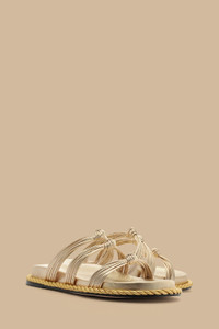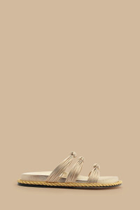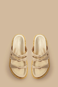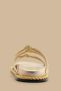 Step into playful elegance with the Gold Knot Slide Sandal by FARM Rio. Brilliant gold tones intertwine in an intricate knot design, melding artistry with comfort. Crafted from responsible materials, its beautiful embroidery evokes a sense of warmth and familiarity. The gentle curves and woven details make it a standout piece, perfect for adding a touch of sophistication and charm to any ensemble. Ref.: sku_344485 Composition Leather Upper & Sole