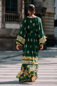 Embrace effortless elegance with the Green Ayla Long Sleeve Ruffled Maxi Dress by FARM Rio. This flowing silhouette dances with soft ruffles along the sleeves and hem, adding a playful movement to every step. The vibrant green hue, inspired by lush Brazilian landscapes, pairs beautifully with the gentle V neckline, creating a flattering and feminine shape. Lightweight and breezy, it's a celebration of comfort and joyful spirit in one stunning dress. - Closure: Invisiblezipper At Center Back - Sleeve type: Long Sleeve Ref.: 351135 Composition 100% VISCOSE Care Instructions MACHINE WASH GENTLE CYCLE, DO NOT BLEACH, DO NOT TUMBLE DRY, LINE DRY IN THE SHADE, IRON AT LOW HEAT, DO NOT DRY CLEAN Fabric origin: India Product manufacturing: India Product printing: India