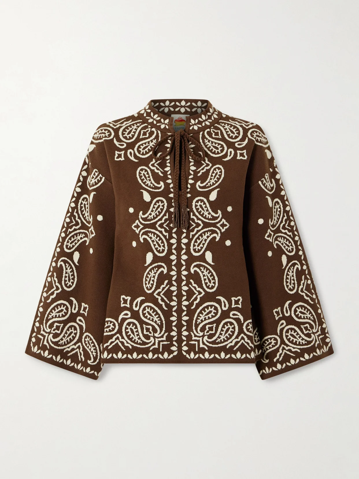 Farm Rio's bohemian sweater has a romantic feel with swirling paisleys knitted across the surface. The tie detail at the keyhole neck can be knotted or left open, depending on your mood. We have the matching pants in our edit, too.