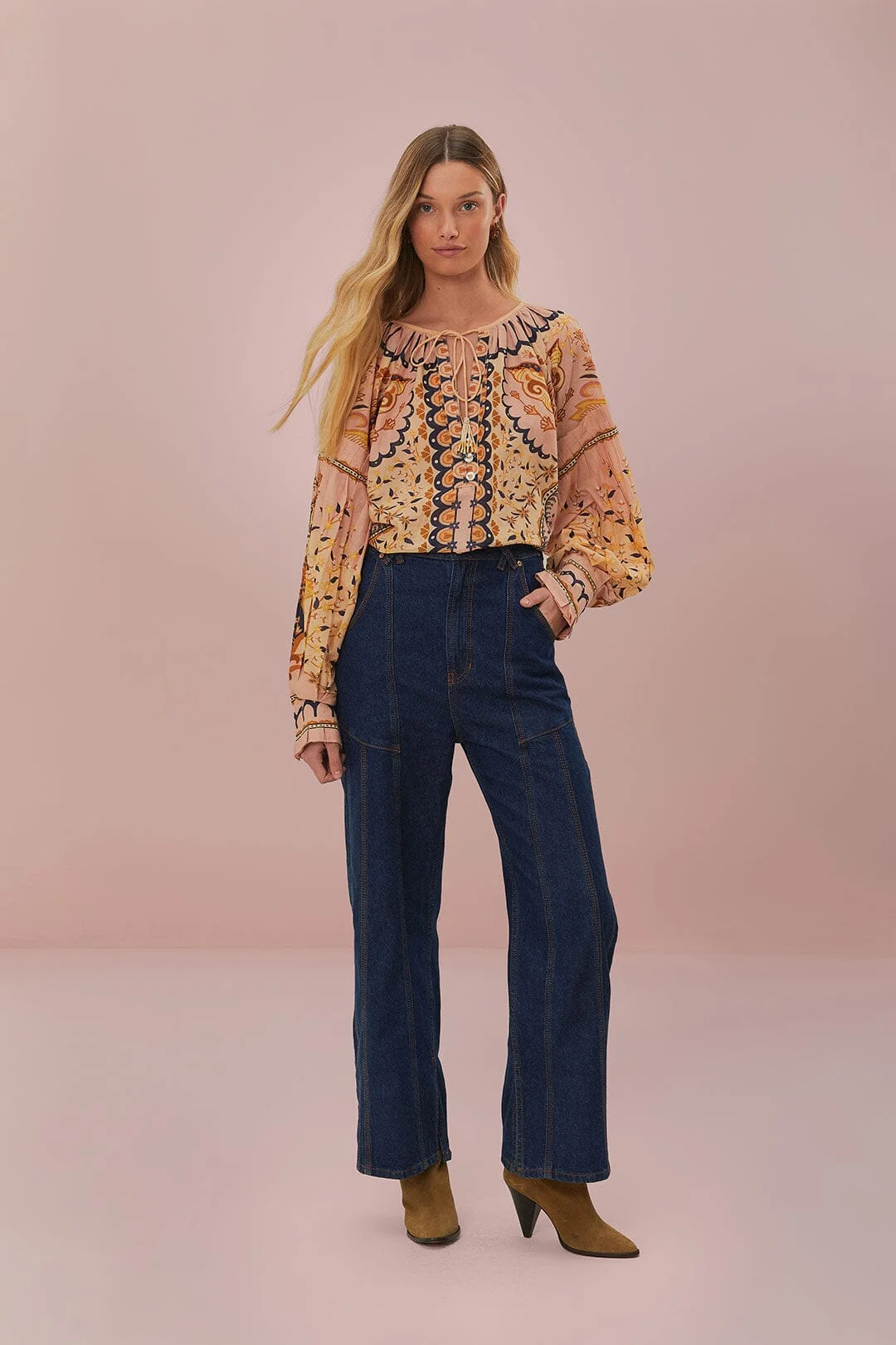 Embrace the vibrant charm of the Beige Jaipur Blouse from FARM Rio. This delightful piece features a round neckline and exquisite floral and paisley patterns in warm, earthy tones. The voluminous sleeves add a playful silhouette, while the intricate pleating and delicate bead details along the neckline bring a touch of bohemian elegance. Perfect for those who love a blend of artistry and comfort in their wardrobe. Ref.: sku_329699 Composition 100% COTTON Care Instructions MACHINE WASH DELICATE CYCLE, DO NOT BLEACH, DO NOT TUMBLE DRY, LINE DRYING, IRON AT MEDIUM HEAT, DO NOT DRY CLEAN Product manufacturing: INDIA Product printing: INDIA