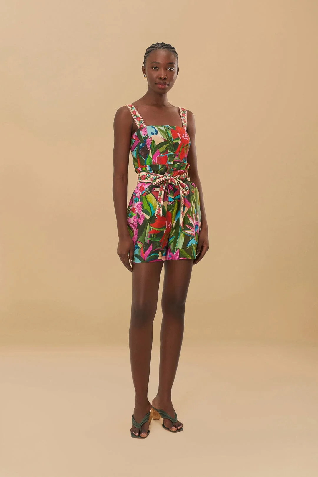 Embrace the vibrant essence of summer with the Multicolor Jardin De Reve Romper. This piece features a charming square neckline framed by delicate straps bordered with an intricate, contrasting trim. The vivacious floral print dances across the fabric in an array of bold hues, while the flattering self-tie waist cinches your silhouette. Each step you take will bloom with the carefree spirit of a garden in revelry. Ref.: sku_338303 Composition 55% LINEN 45% VISCOSE Care Instructions MACHINE WASH SEPARATELY, DO NOT BLEACH, DO NOT TUMBLE DRY, LINE DRYING, IRON AT LOW HEAT, DRY CLEAN WITH SOLVENT EXCEPT TRICHLOROETHYLENE Product manufacturing: CHINA Product printing: CHINA