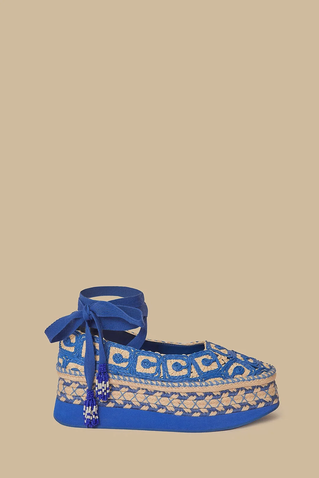 Step into vibrant style with the Klein Ballerina Espadrille Flatform Sandal. Bursting with rich blue hues, these espadrilles feature charming embroidery that evokes playful elegance. The intricate patterns embellish the flatform silhouette, blending traditional allure with contemporary flair. Crafted from responsible materials, the ankle wrap ties add a touch of whimsy, making every step feel like a dance. Perfect for those who cherish a blend of comfort and artistry. Ref.: sku_341162 Composition SYNTHETIC (PP) UPPER & SYNTHETIC SOLE