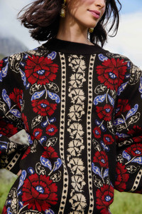 Embrace cozy elegance with the Black Valentina Puff Sleeve Knit Dress by FARM Rio. This knitwear treasure features a high neckline and voluminous puff sleeves that bring a playful silhouette to life. Adorned with striking red and blue floral motifs against a rich black backdrop, the dress feels like a warm, artistic embrace. The fringed hem adds a touch of bohemian charm, making it a statement of soft sophistication and vibrant spirit.- Sleeve type: Long Sleeve Ref.: 340225 Composition 30% POLYESTER 24% VISCOSE 24% POLYAMIDE 22% ACRYLIC Care Instructions HAND WASH SEPARATELY, DO NOT BLEACH, DO NOT TUMBLE DRY, DRY FLAT, IRON AT LOW HEAT, DRY CLEAN WITH ANY SOLVENT EXCEPT TRICHLOROETHYLENE Fabric origin: China Product manufacturing: China Product printing: China