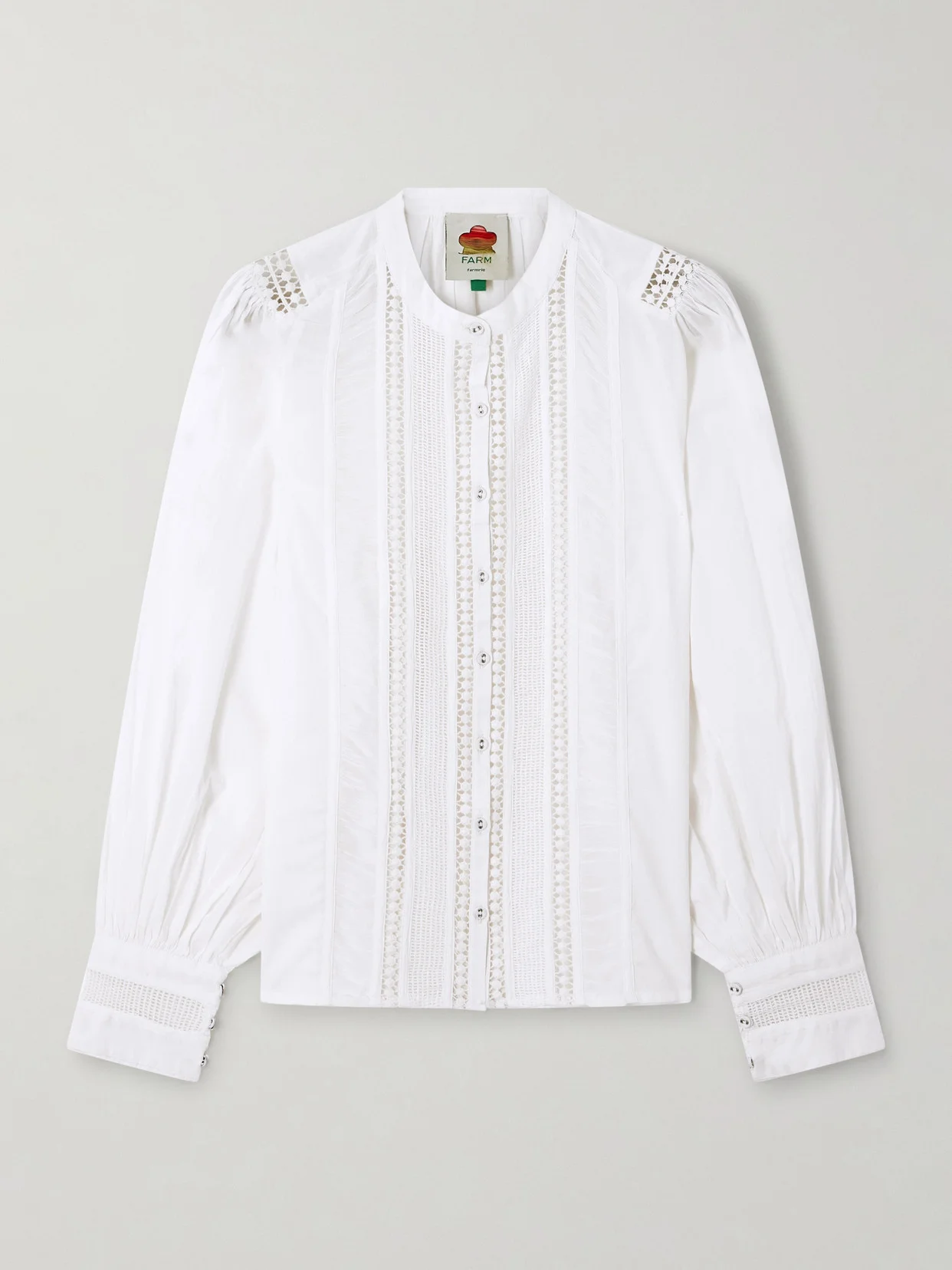 Farm Rio's blouse is trimmed with delicate lace panels that show a little skin while adding to the breezy, bohemian feel. It's made from pure cotton with billowing sleeves and has a rounded collar that can be unbuttoned for a more relaxed look.