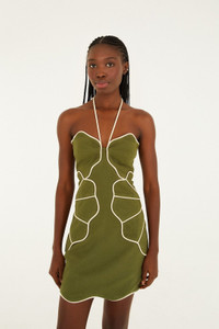 Embrace effortless charm in the Green Wavy Trim Halter Neck Mini Dress by FARM Rio. Crafted from eco-friendly Euroflax and Lenzing fibers, this dress boasts a serene green hue that dances with subtle wavy trims along the halter neckline. Its flowing silhouette gently skims the body, blending comfort with playful elegance. Perfect for sunlit days, it carries the brand’s signature warmth and vibrant spirit into every occasion. - Closure: Invisible Zipper At Center Back - Sleeve type: Sleeveless Ref.: 344455 Composition 55% LINEN 45% VISCOSE Care Instructions HAND WASH SEPARATELY, DO NOT BLEACH, DO NOT TUMBLE DRY, DRY FLAT, IRON AT LOW HEAT, DRY CLEAN WITH ANY SOLVENT EXCEPT TRICHLOROETHYLENE Fabric origin: China Product manufacturing: China Product printing: China