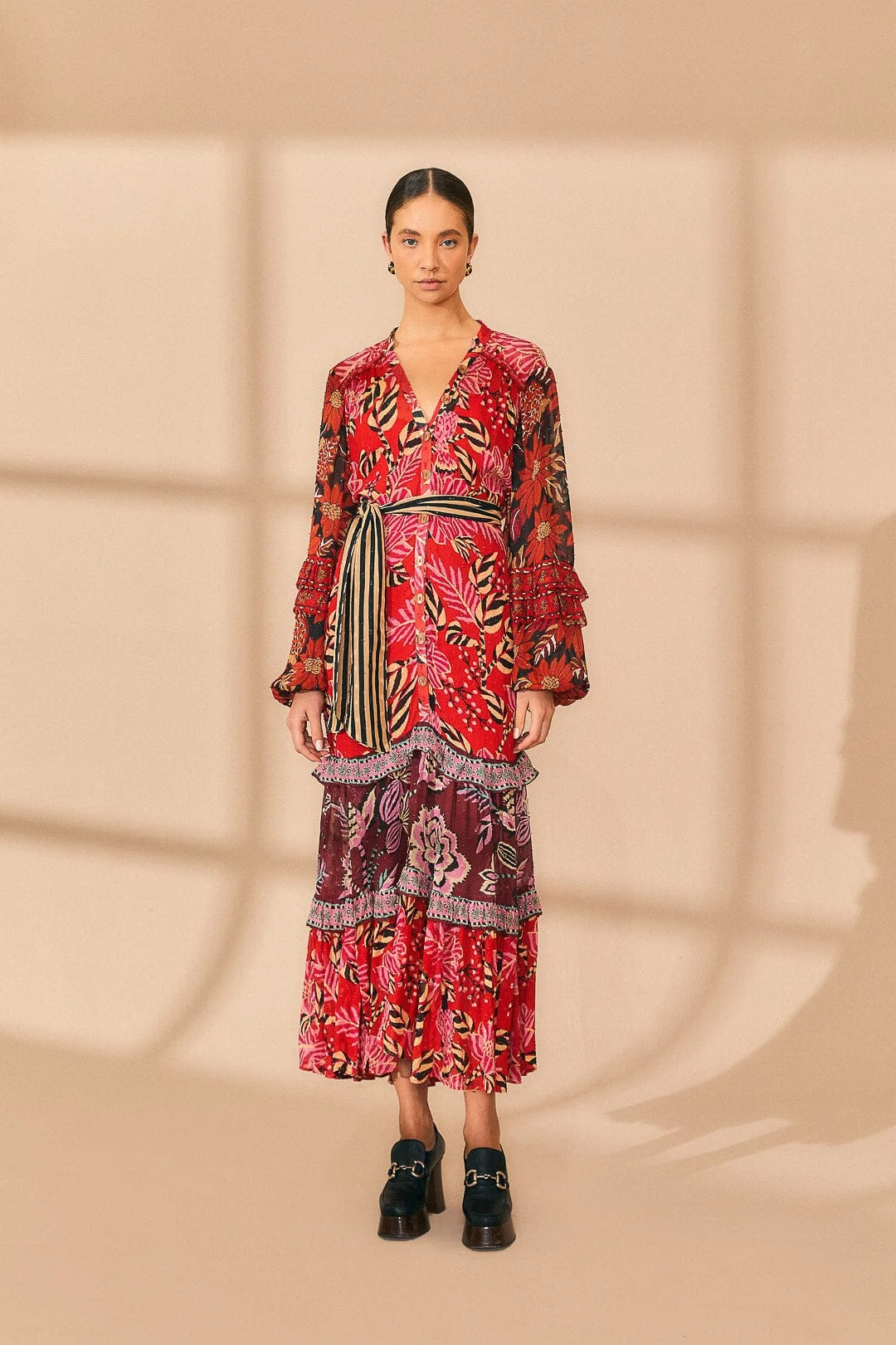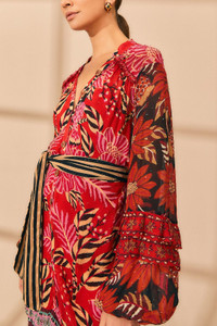 What if a warm embrace could transform any chilly day into a nurturing moment of contentment? That's the essence of our FW23 collection. Our pieces add an unexpected twist to the Fall-Winter wardrobe, inviting you to infuse the season with new colors, play around with style, and enjoy every little detail. Whether in earthy or vibrant tones, cozy or fluid shapes, you'll be ready to overcome Winter blues with an extra cup of happiness. - Easy fit - V neck - Center front button placket - Long sleeves - Detachable belt - Ruffled detailing - Layered skirt Ref.: sku_312351 Composition 100% VISCOSE Care Instructions MACHINE WASH ON DELICATE CYCLE, DO NOT BLEACH, TUMBLE DRY LOW, IRON AT MEDIUM HEAT, DRY CLEAN WITH ANY SOLVENT EXCEPT TRICHLOROETHYLENE