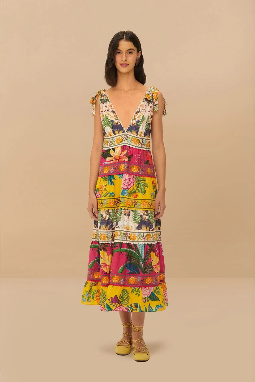 Embrace vibrant elegance with the Mixed Flowers Midi Dress from FARM Rio. This delightful piece showcases a captivating mix of floral patterns in rich shades of pink, yellow, and green. The dress features a flattering V neckline, playful tie straps at the shoulders, and a flowy, tiered silhouette that promises to enchant. Perfect for adding a splash of joy and color to any occasion. FARM Rio Ref.: sku_332265 Composition 100% COTTON Care Instructions MACHINE WASH GENTLE CYCLE, DO NOT BLEACH, DO NOT TUMBLE DRY, LINE DRY, LOW IRON, DO NOT DRY CLEAN Product manufacturing: INDIA Product printing: INDIA