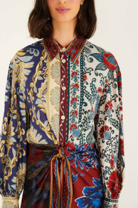 Flowing with a rich patchwork of vibrant navy, warm rust, and cream, this midi dress embraces an artful mix of floral and paisley patterns. Crafted from eco-conscious Lenzing Ecovero viscose, it offers a soft, silky drape. The structured collar and billowing sleeves evoke an elegant vintage spirit, while the self-tie waist adds a playful, flattering silhouette—perfect for bringing warmth and charm to winter days with a touch of FARM Rio’s joyful creativity. - Closure: Center Front Buttons - Button type: Plastic Button - Sleeve type: Long Sleeve Ref.: 340578 Composition 100% VISCOSE Care Instructions MACHINE WASH GENTLE CYCLE, DO NOT BLEACH, DRY FLAT, IRON AT MEDIUM HEAT, DO NOT DRY CLEAN Fabric origin: China Product manufacturing: China Product printing: China