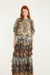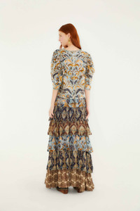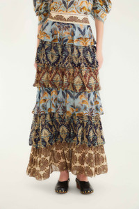 Celebrate bold elegance with the Mixed Scarves Ruffled Maxi Skirt by FARM Rio. This enchanting piece features tiered layers of vibrant, vintage-inspired prints that cascade in playful ruffles. Earthy tones blend with soft blues and warm browns, creating a tapestry of intricate florals and baroque motifs. The flowing silhouette embraces a graceful movement, perfectly capturing the brand’s signature joyful and artistic spirit. Ideal for moments where beauty meets comfort.- Closure: Invisible Zipper At Side Seam Ref.: 340412 Composition 100% VISCOSE Care Instructions MACHINE WASH GENTLE CYCLE, DO NOT BLEACH, DO NOT TUMBLE DRY, LINE DRY IN THE SHADE, IRON AT LOW HEAT, DRY CLEAN WITH ANY SOLVENT EXCEPT TRICHLOROETHYLENE Fabric origin: India Product manufacturing: India Product printing: India