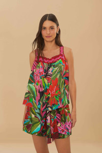 Welcome a playful twist to your wardrobe with the Multicolor Jardin De Reve Shorts from FARM Rio. These shorts bloom with an exuberant tropical flora print in a spectrum of vibrant colors, adding a touch of whimsy to your look. A flattering high-waist cut pairs beautifully with the delicate side tie, creating a silhouette that's both relaxed and refined. The contrasting trim adds an unexpected pop, ensuring you'll turn heads in these joyful, spirited shorts. Ref.: sku_338613 Composition 55% LINEN 45% VISCOSE Care Instructions HAND WASH SEPARATELY, DO NOT BLEACH, DO NOT TUMBLE DRY, LINE DRYING,, IRON AT LOW HEAT, DO NOT DRY CLEAN Product manufacturing: CHINA Product printing: CHINA