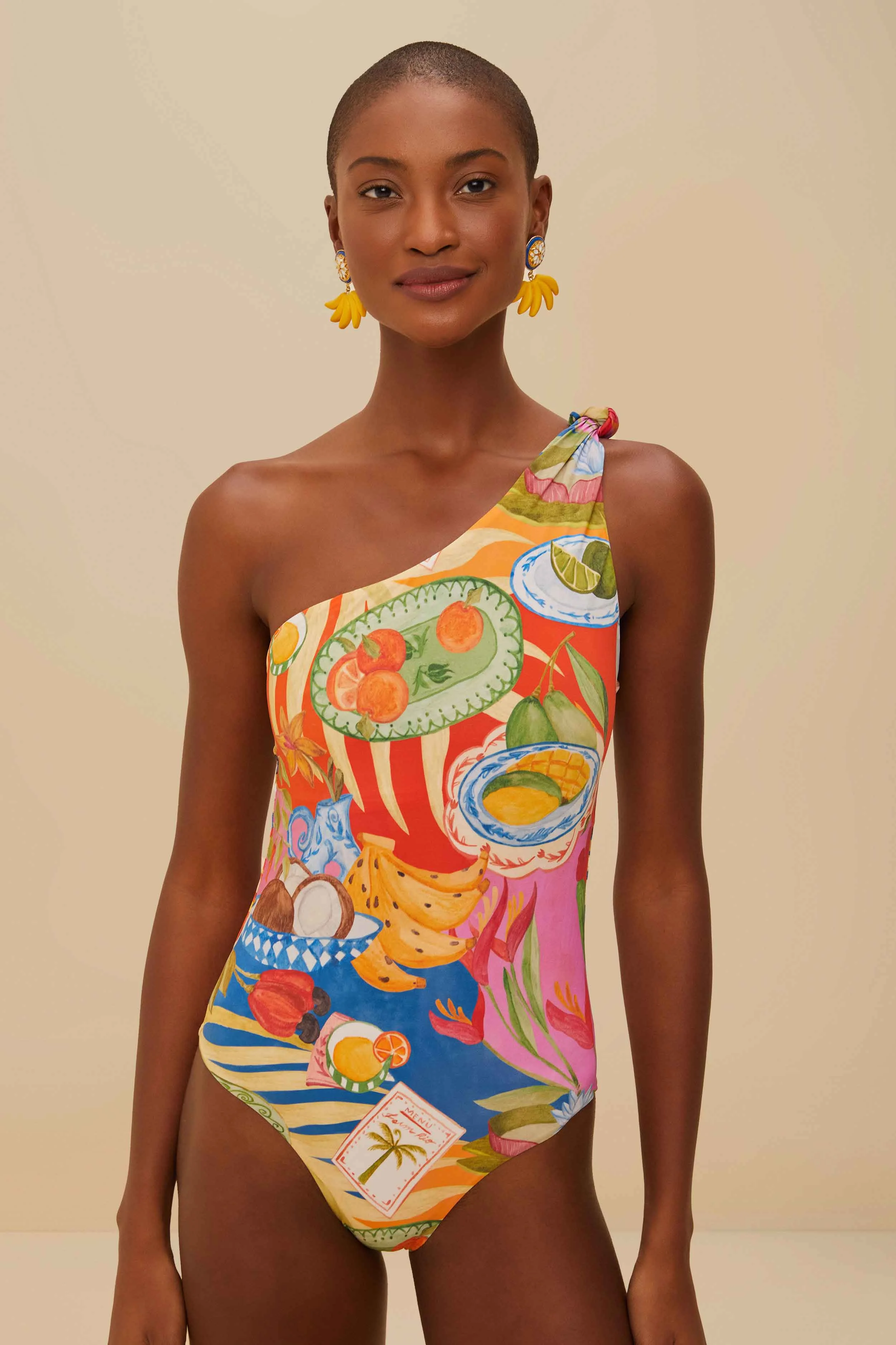 Embrace the vibrant allure of the Multicolor Summer Picnic One-Piece Swimsuit from FARM Rio. This uniquely captivating one-shoulder piece showcases a lively picnic-inspired print bursting with colorful fruits and tropical motifs. The playful, asymmetrical silhouette offers an effortlessly chic look, while the artistic design embodies the essence of sun-kissed joy. Perfect for adding a splash of Brazilian sunshine to your wardrobe. - Sleeve type: Sleeveless Ref.: sku_336741 Composition 75,5% POLYAMIDE 24,5% ELASTANE Care Instructions MAXIMUM WASHING TEMPERATURE 30°, MILD PROCESS, DO NOT BLEACH, TUMBLE DRYING POSSOBLE, DO NOT IRON, DO NOT DRY CLEAN